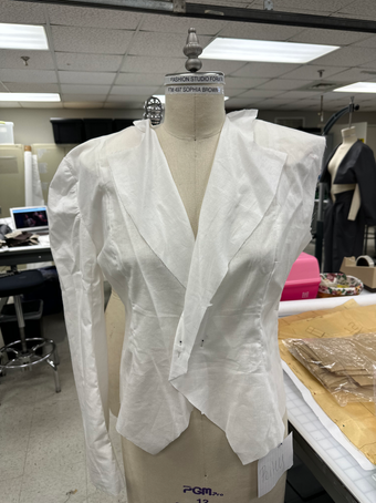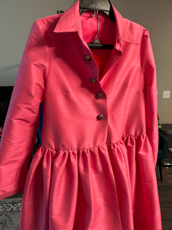 My design inspiration for The Evangelista is very near and dear to me. I looked to my mother whose signature wardrobe staple is an oxford shirt. I wanted to bring drama and volume to a classic oxford shirt in a fun pink - adding a contrast with a bold red for the pencil skirt. The underskirt has a kick-pleat in the back as well well ask pockets on each side. The combination makes a strong statement of confident femininity.